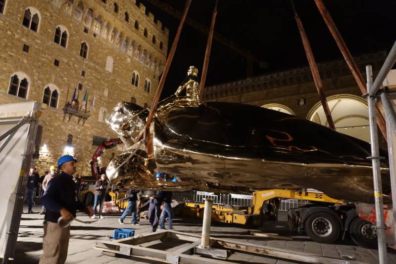 Dal 15 aprile tutte e due le opere saranno pienamente visibili, inoltre in Palazzo Vecchio una serie di sculture dialogherà con gli affreschi e i manufatti conservati in alcune sale del percorso museale del palazzo. Tra le opere esposte anche un grande mappamondo (2.50 m di diametro) rivestito interamente di scarabei dal carapace cangiante, la cui forma e dimensione interloquisce perfettamente con il celebre globo conservato nella Sala delle Mappe geografiche, opera cinquecentesca di Ignazio Danti.